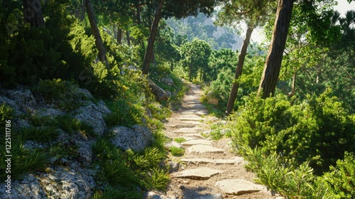 Serene hiking trail through tranquil pine forest nature landscape scenic viewpoint fresh air sunlight filtering