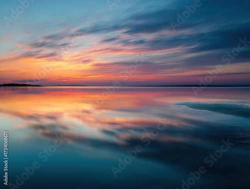 Serene horizon landscape with gentle pastel colors, water reflecting sky at dusk, motion blur