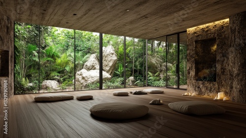 Serene Indoor Meditation Space Surrounded by Lush Greenery