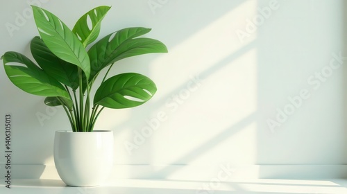 Serene indoor plant in a minimalist white pot, bathed in sunlight against a bright wall