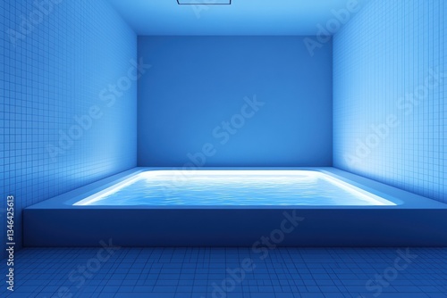 Serene indoor pool bathed in calming blue light. Minimalist design, clean lines, and tranquil atmosphere.