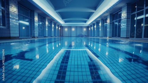 Serene indoor swimming pool with soft lighting, perfect for relaxation and exercise. Reflective water and architecture create a peaceful ambiance.