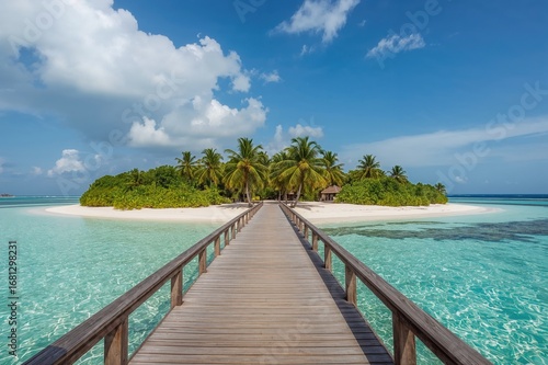 Serene island escape with palm-lined walkway, pristine sands, and crystal-clear waters, ideal for a summer getaway.
