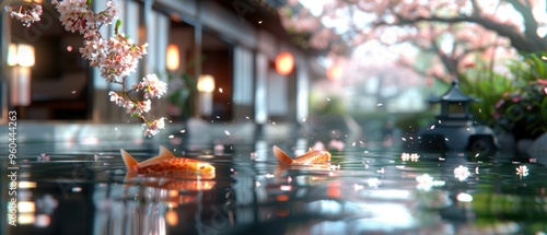 Serene Japanese Garden with Cherry Blossoms and Koi Pond - in Quality