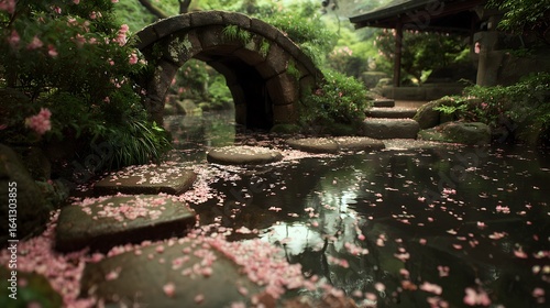 Serene Japanese Garden With Stone Bridge And Pink Flowers