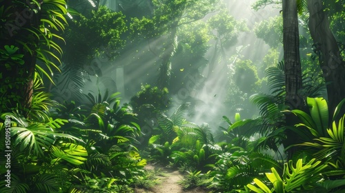 Serene jungle pathway bathed in sunlight streaming through lush vegetation