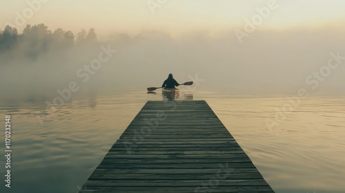 Serene Kayaker on Foggy Lake at Dawn with Wooden Pier Landscape
