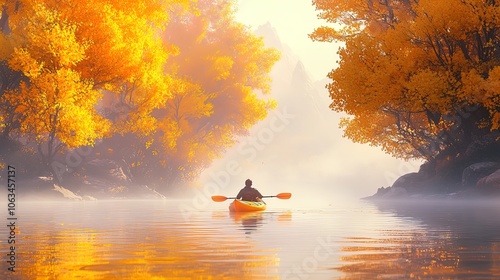 Serene Kayaking Adventure: A Stunning Poster of a Kayaker Paddling through a Misty River, Surrounded by Vibrant Fall Foliage - Perfect for Sports-Inspired Interiors!
