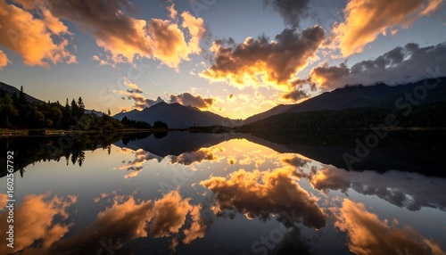 Serene lake at sunset reflecting a fiery sky