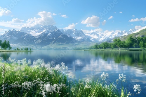 Serene lake in the springtime, flanked on both sides by lush green grass meadows