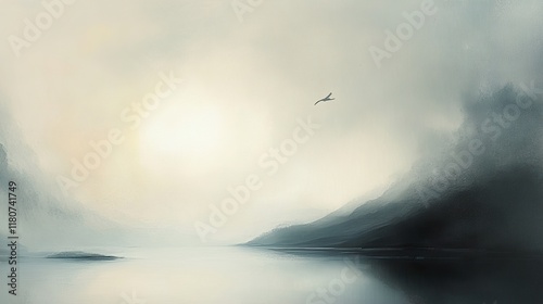Serene Lake Landscape: Minimalist Foggy Mountain View