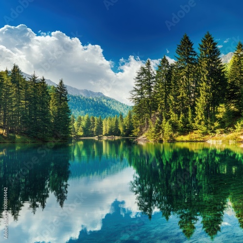 Serene Lake Reflecting Lush Forest and Clear Sky
