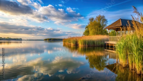 Serene lake shore at Ruhiges Seeufer am Scharm?tzelsee in Brandenburg with reeds and a covered sky, serene lake, scharm?tzelsee