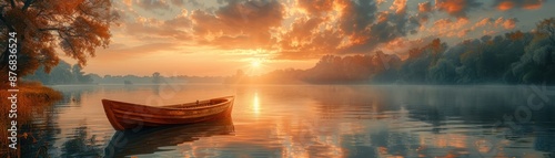 Serene lake with a wooden boat at sunrise, reflecting vibrant colors in the sky and water, surrounded by trees and calmness.