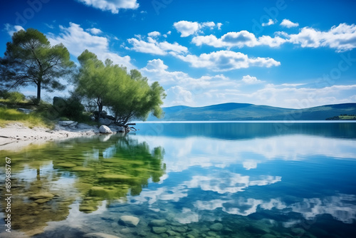 Serene Lake with Tree Reflection, Green Mountains, Blue Sky