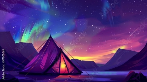 Serene Lakeside Camping Under Northern Lights Night Sky
