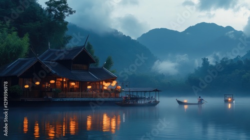 Serene Lakeside House with Illuminated Lanterns at Dusk, Misty Mountains in Background