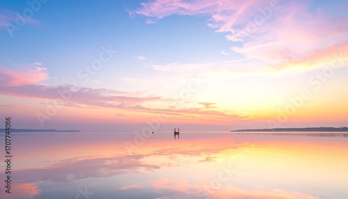 Serene landscape featuring a calm body of water reflecting a vibrant sunset sky with pink and orange hues, and distant land.