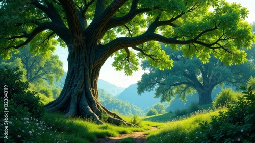 Serene Landscape Featuring Ancient Tree and Lush Greenery, Peaceful Meadow Path Leading Through Verdant Hills