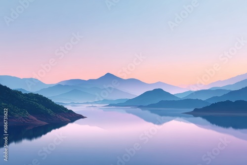 Serene landscape featuring tranquil lake reflecting soft pastel hues of dawn, surrounded by majestic mountains and lush greenery, creating a peaceful natural scene