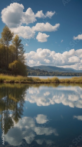 Serene landscape of a clear blue lake under a sunny sky with fluffy clouds.