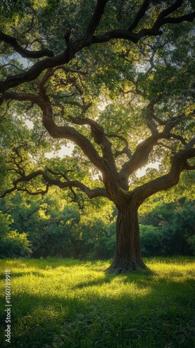 Serene Landscape of a Large Oak Tree in a Green Field with Forest Background, ideal for nature, outdoor and environmental concepts
