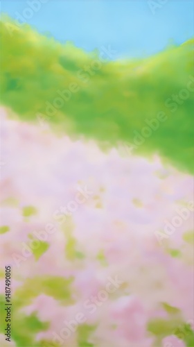 Serene Landscape of Floral Harmony: Ethereal Beauty in a Vibrant Greenery Meadow with Pastel Colors and Gentle Hills