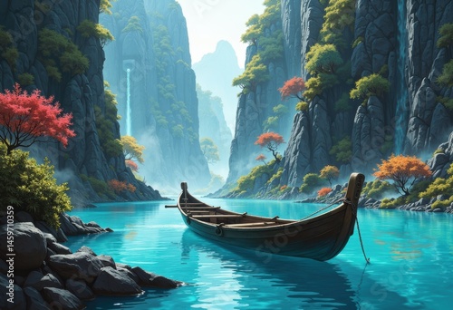 Serene landscape with a boat gliding through a tranquil river surrounded by mountains