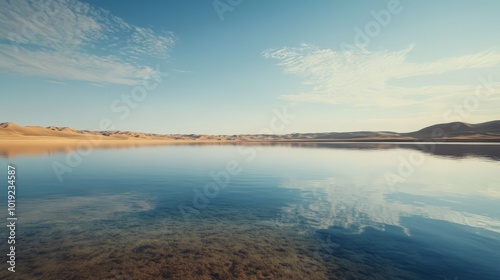 Serene landscape with calm lake reflecting the clear sky and distant hills, under a bright, sunny atmosphere. Perfect for peaceful inspiration.