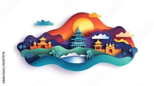 Serene Landscape with Pagodas and Mountains in Vibrant Colors