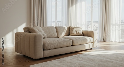 Serene living room Beige sofa with throw pillows, sheer curtains, and light streaming in from the sunlit balcony