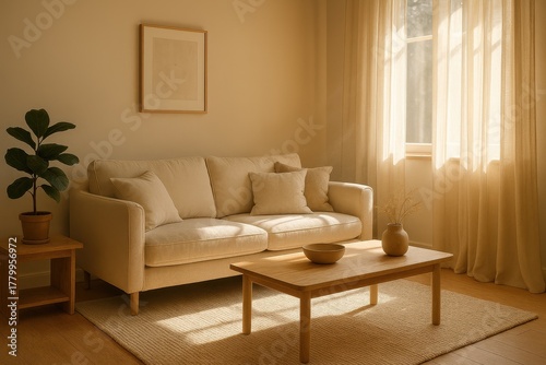 Serene living room with linen sofa natural wood accents and soft morning sunlight streaming