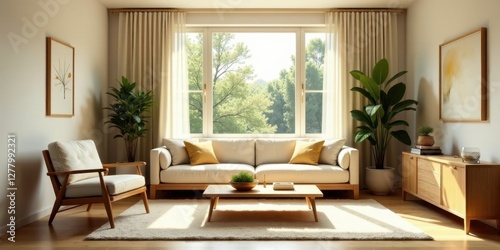 Serene Living Room with Natural Light and Minimalist Decor Featuring a Comfortable Sofa and Armchair