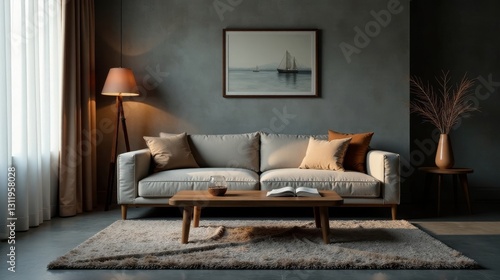 Serene living room with soft light illuminating a neutral colored couch, coffee table, and floor rug, complemented by tasteful decor