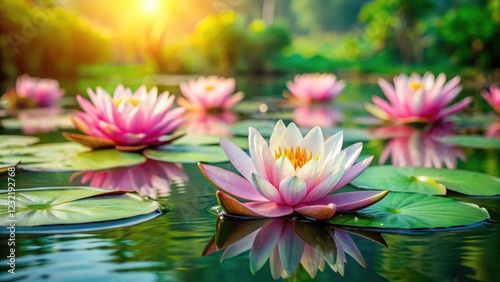 Serene lotus flowers blooming in lake water with green leaves floating on the surface, nature photography, water lilies