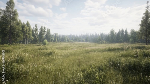 Serene meadow landscape with lush green grass, distant trees, and a cloudy blue sky
