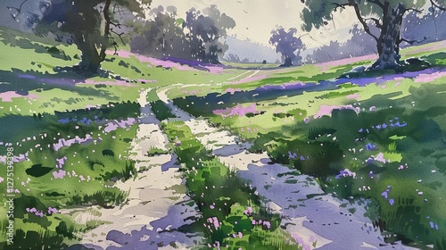 Serene Meadow Pathway Surrounded by Lush Green Trees and Flowers
