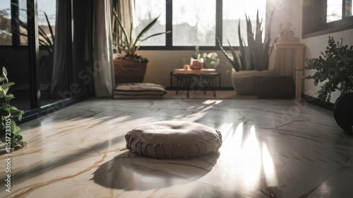serene meditation space with round cushion on marble floor, surrounded by plants and natural light. Perfect for relaxation and mindfulness practices