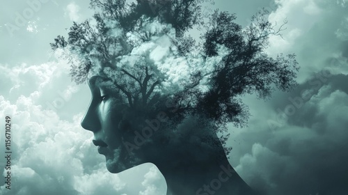 Serene Mind: A Woman's Profile with an Overlaid Tree and Cloudscape