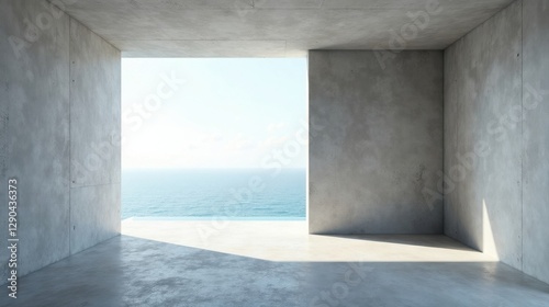 Serene Minimalist Concrete Room with Ocean View, Ideal for Relaxation and Contemplation