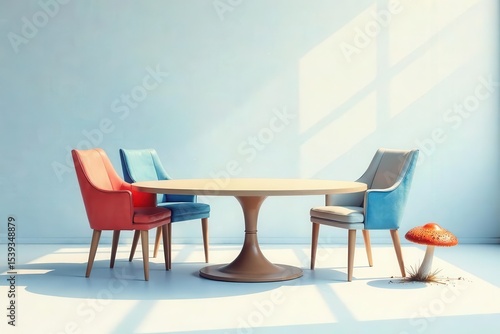Serene Minimalist Dining Room Setting with Pastel Chairs and a Single Mushroom