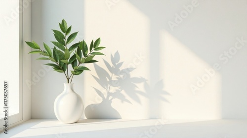 Serene Minimalist Greenery in a White Vase Casts a Gentle Shadow on a Bright Wall