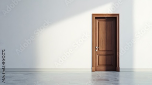 Serene Minimalist Interior with Pristine White Walls and a Wooden Door Accentuated by Natural Light