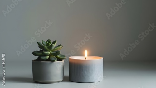 Serene Minimalist Still Life, Gray Candle and Succulent Plant