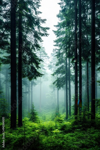 Serene misty forest with tall trees and lush green foliage, creating a tranquil and peaceful natural scenery perfect for nature lovers.