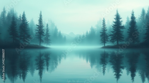 Serene Misty Lake Surrounded by Pines in Tranquil Blue Atmosphere
