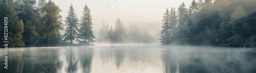 Serene misty morning lake scene with still waters reflecting surrounding pine and evergreen trees in a tranquil, peaceful, and calming atmosphere.