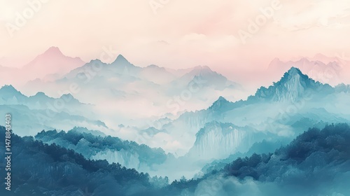 Serene misty mountain range landscape with ethereal pink sky backdrop