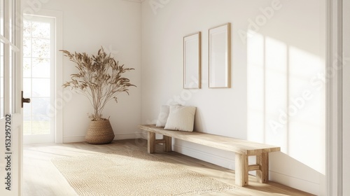 Serene Modern Interior with Natural Light, Minimalist Decor, and Simple Wooden Bench in Cozy Space