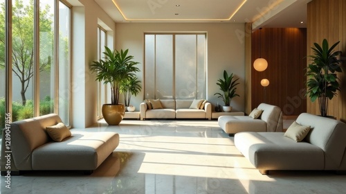 Serene Modern Living Space with Sunlight Streaming Through Large Windows and Lush Greenery